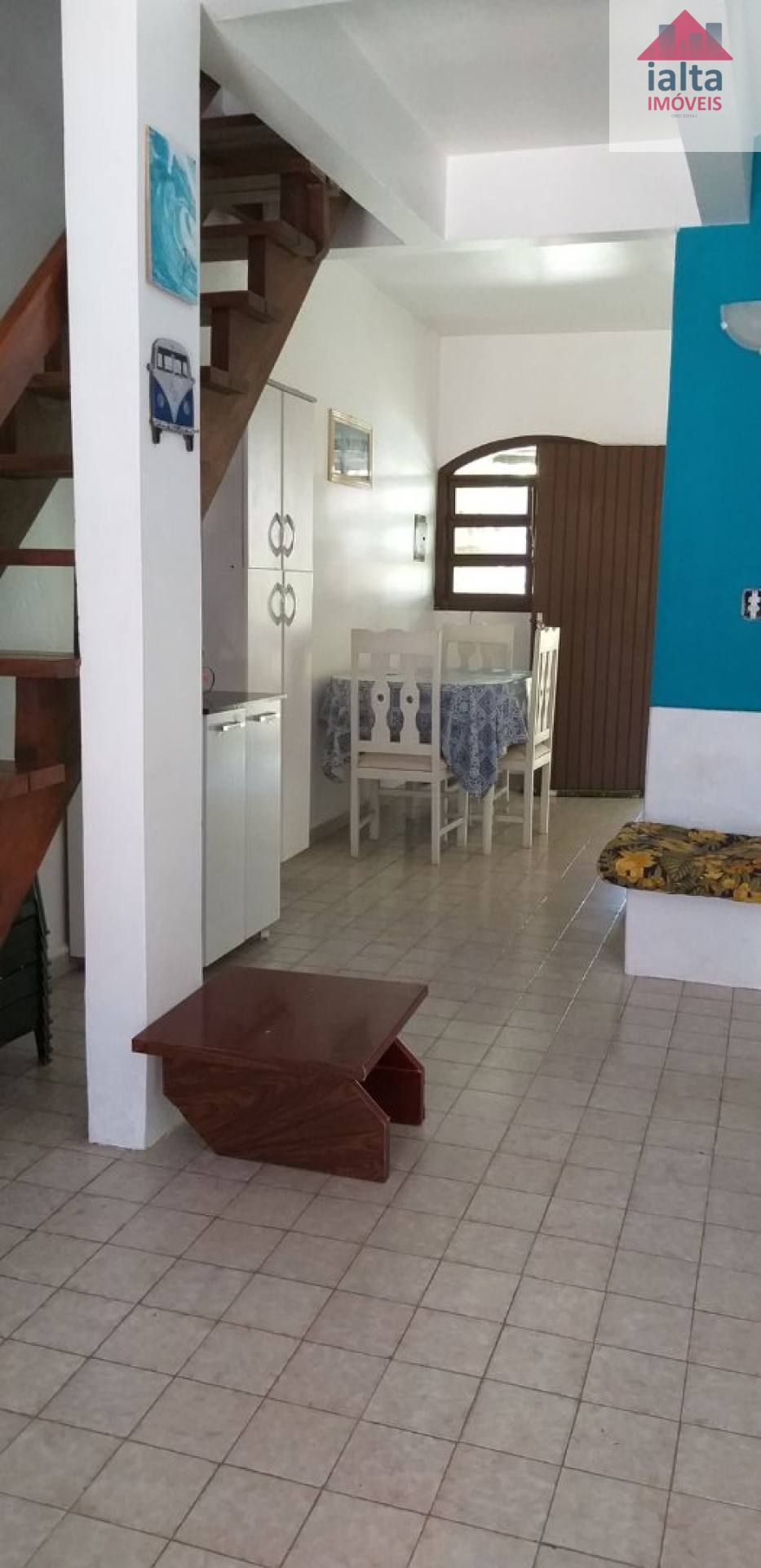 Piso inferior: sala de estar, cozinha, banheiro social, área interna e área de serviço