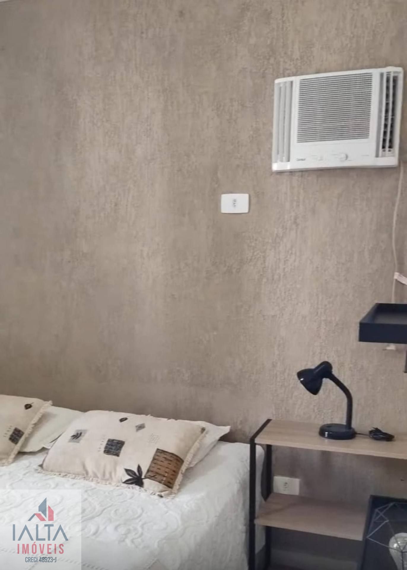 O apartamento é mobiliado e possui armários embutidos, otimizando o espaço.