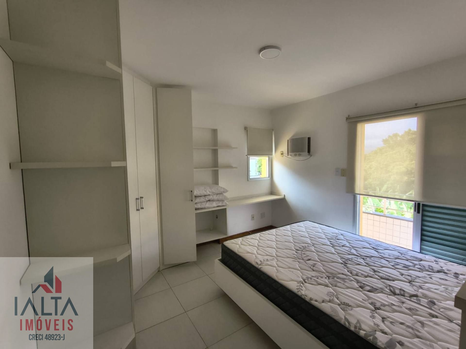 A presença de armários embutidos otimiza o espaço, enquanto a sacada oferece uma vista agradável e um espaço extra para relaxar.