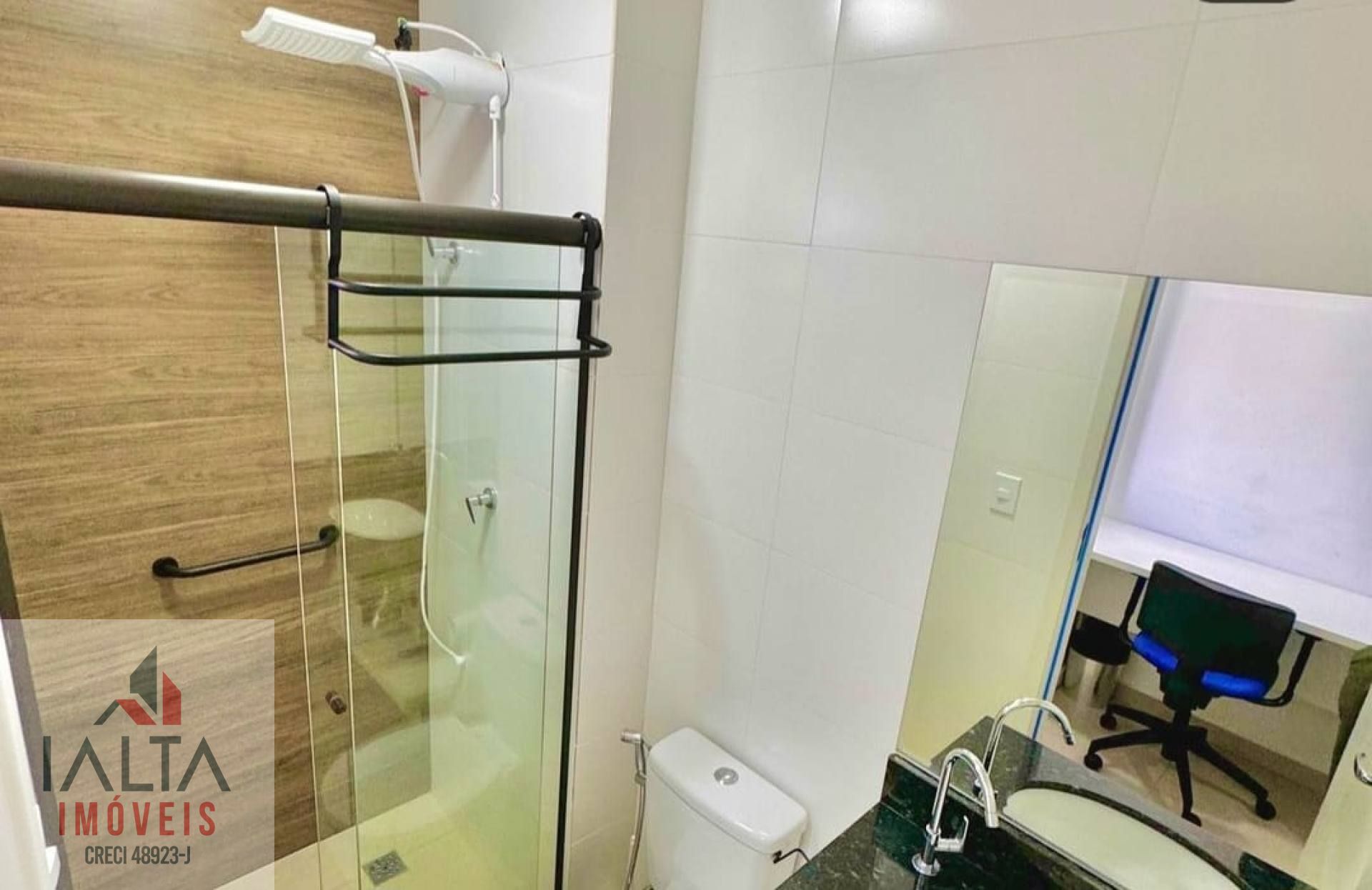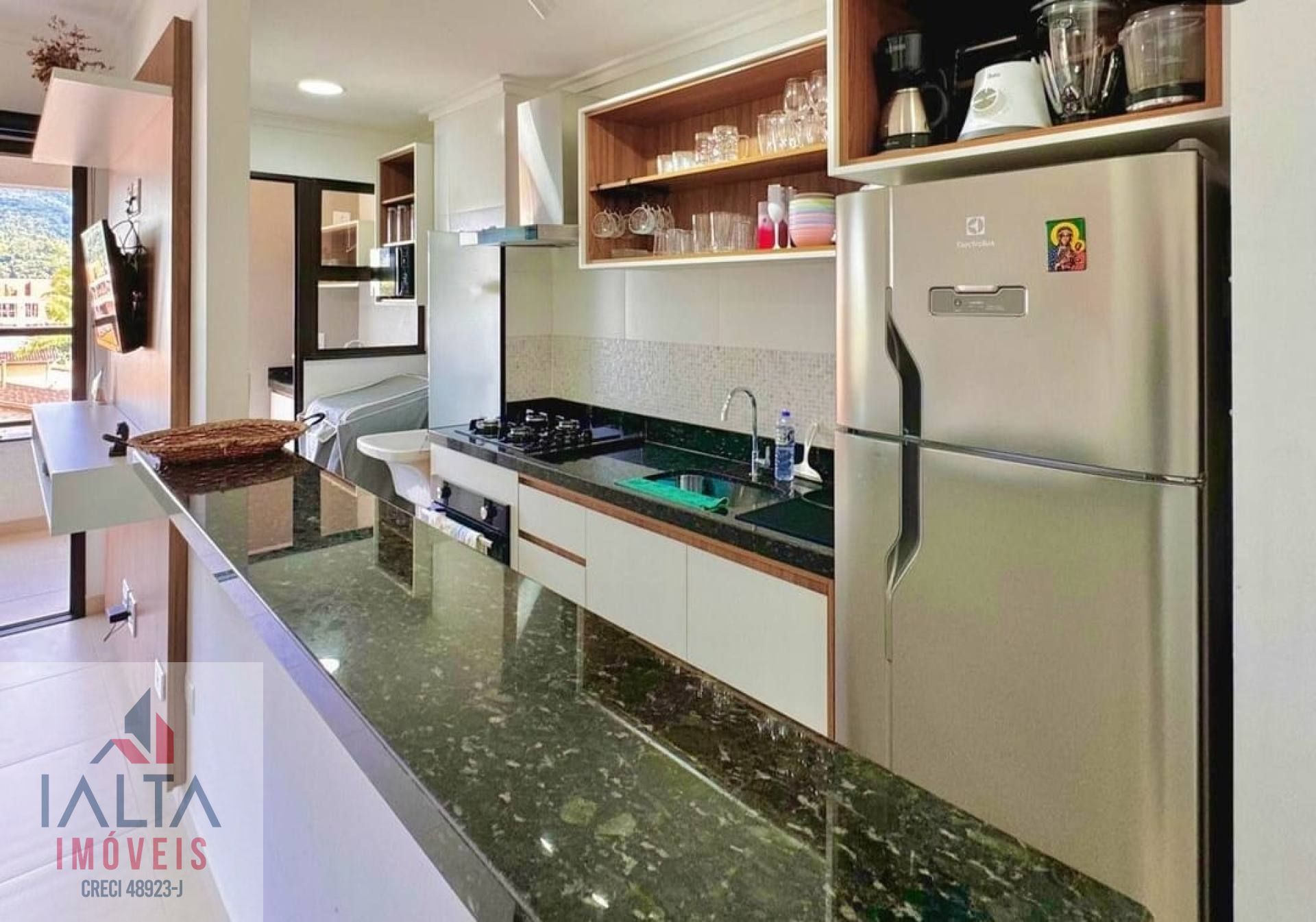 O apartamento é mobiliado e possui armário de cozinha, facilitando a organização.